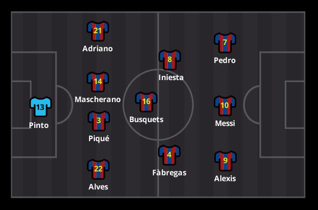 IF dijo: dicen que xavi suplente hoy Yo jugaria con Pinto (pq no hay mas remedio) Alves-Bartra (a no ser que Piqué este bien de verdad)-Masche-Adriano (igual que lo de Piqué pero con Alba) Xavi-Busquets-Iniesta Alexis-Messi-Pedro (lo mismo que antes xa Neymar) Banquillo Cesc, Tello, Song... |