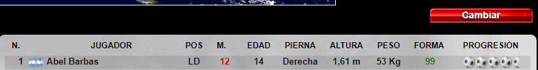 Buenos dias, hoy partido en teoría comodo ante el compa meleterico que marca el farolillo rojo de mi liga. Me extraña ver que tiene hundida la moral de casi todos sus jugadores salvo de, intuyo, su once titular. No pondrá el psicologo? Por otro lado, necesito AMISTOSO URGENTE EN BATA para mañana y otro para el jueves que viene si JE5 me acepta el amistoso de la interprivadas. |